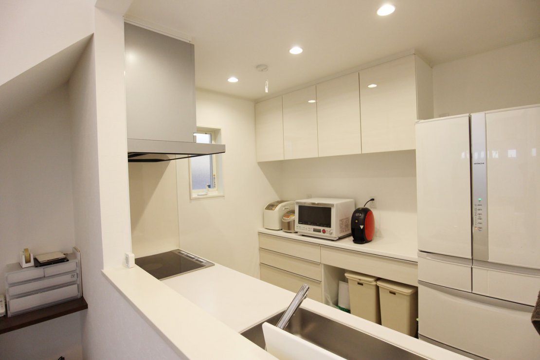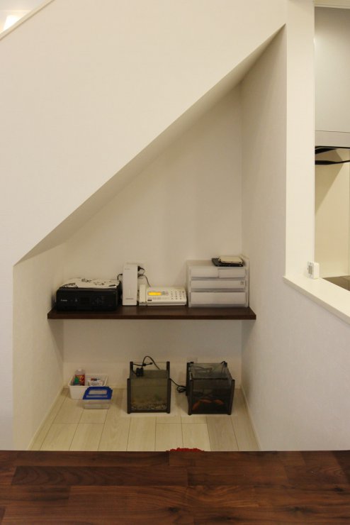 2階に子供部屋が3部屋と寝室を作りたかったので、2CABINに決めました。基本的に、物が外に出ているのが嫌いなので、全てのものをしまえるように、作り付けの収納を多くしてもらいました。食器棚も作り付けなので、地震が来ても倒れたりする心配がありません。収納が多いと床の掃除がラクで助かります。階段下はあえて収納にせず、カウンターを付けてプリンターや金魚の水槽を置いています。ここが開いているとリビング全体が広く見える気がします。