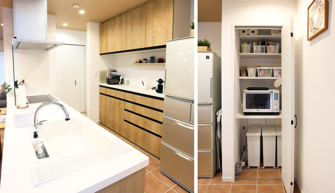 ▲キッチン横のパントリーに、電子レンジやゴミ箱もスッキリ収納。