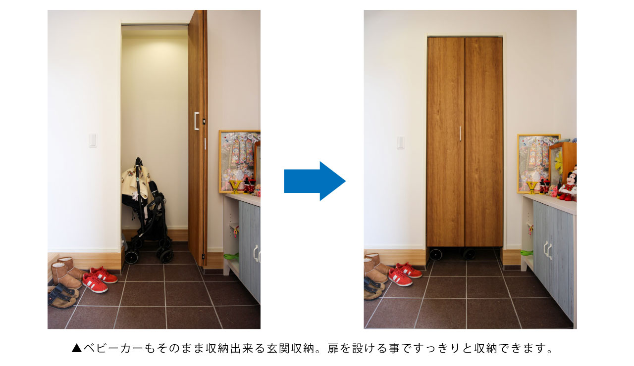 ▲普段は閉じているこの場所も、しっかりベビーカーがしまえる、収納力のあるシューズインクロークに