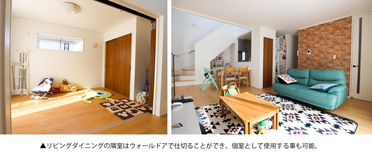 ご主人様:変えたのは、リビングからつながる洋室をウォールドアで仕切るようにして、その扉をしまう戸袋を設けたぐらいです。