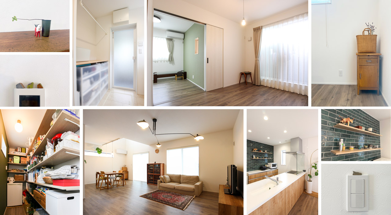 キッチン背面のタイルや照明は自分たちで好みのものを探して付けてもらいました。床やドアの色も選び、全体的にグリーン系を生かした落ち着いた色彩になりました。息子たちは広いリビングを走り回っており、私たちも生活音を気にせずに過ごすことができています。