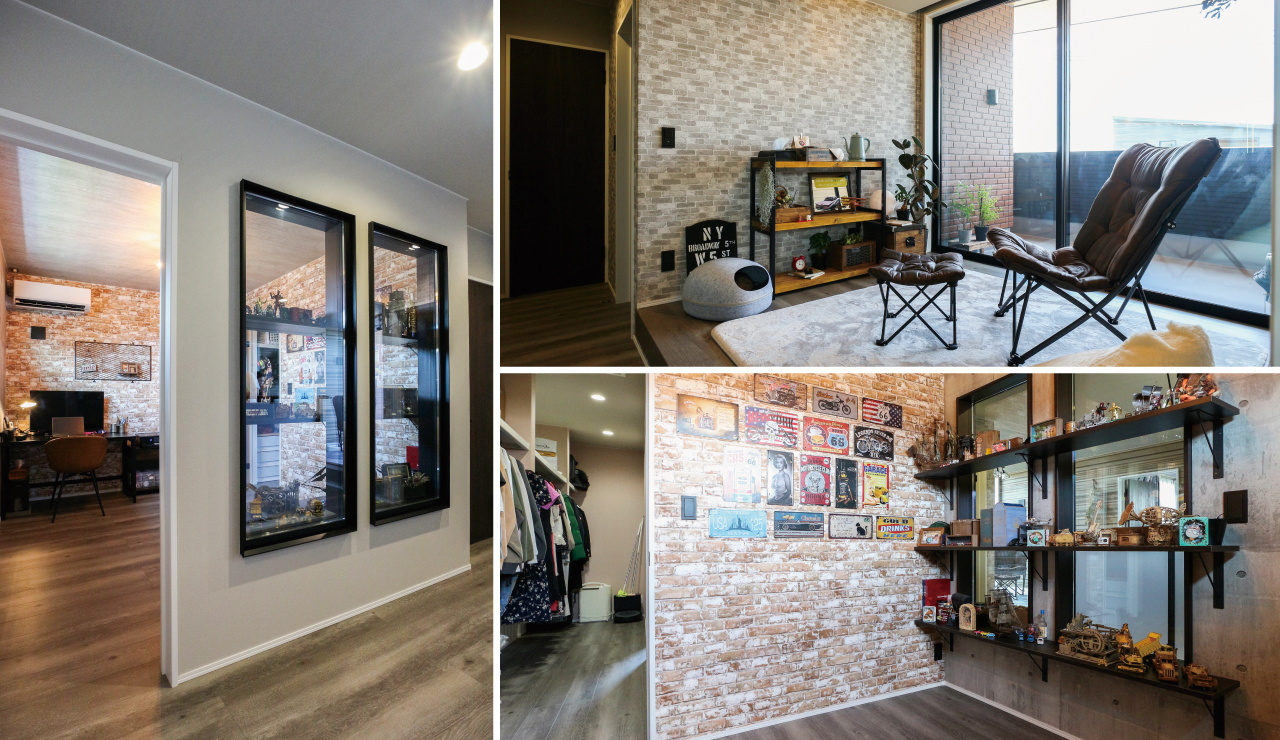 ご主人様:私の部屋の壁。ガラス張りにしてもらいました。模型を飾れるようにしたくて。廊下側の壁を色々試行錯誤してガラスにしてもらったんです。